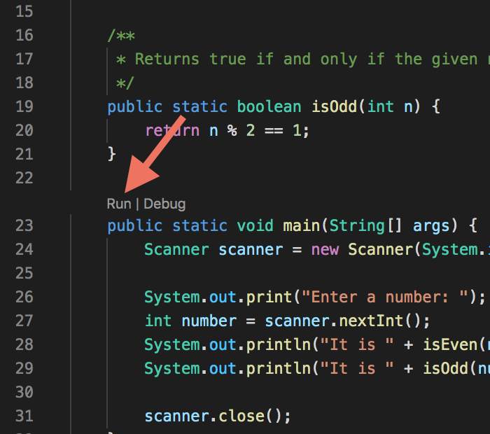 Now study the main() method. What is it going to do? Just above the main method, VS Code shows “Run” and “Debug” links. Click Run and try it out: