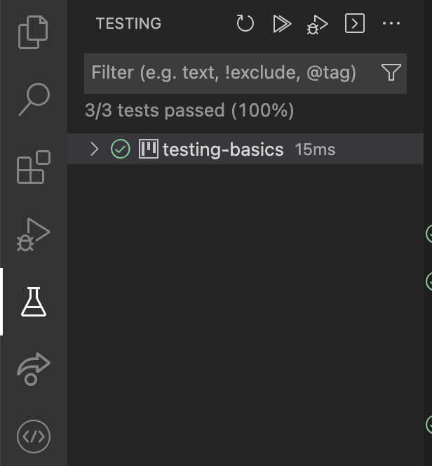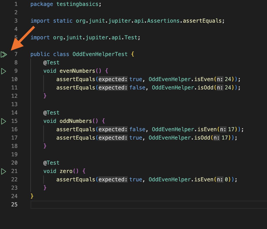 That is VS Code’s “Run” icon. You can choose to run just one individual test — but you want to run all of them! Click the double triangle that appears to the left of the first line of the whole class: