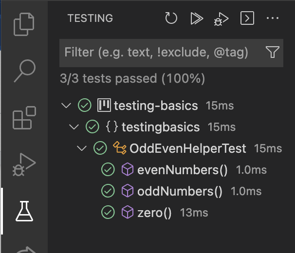 When you click that icon, several things will happen: Java takes a moment to run the tests. Then, after they’ve run, the Run icons change to green checkmarks: one next to each individual test, plus one at the top of the class to show that all tests inside the class passed. You can rerun those tests by clicking the green checkmarks.